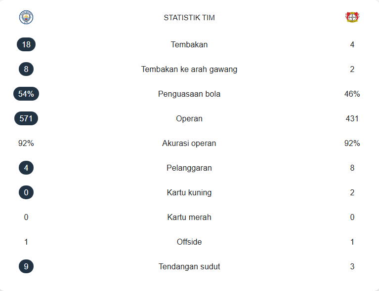 Statistik pertandingan Man City vs Leverkusen